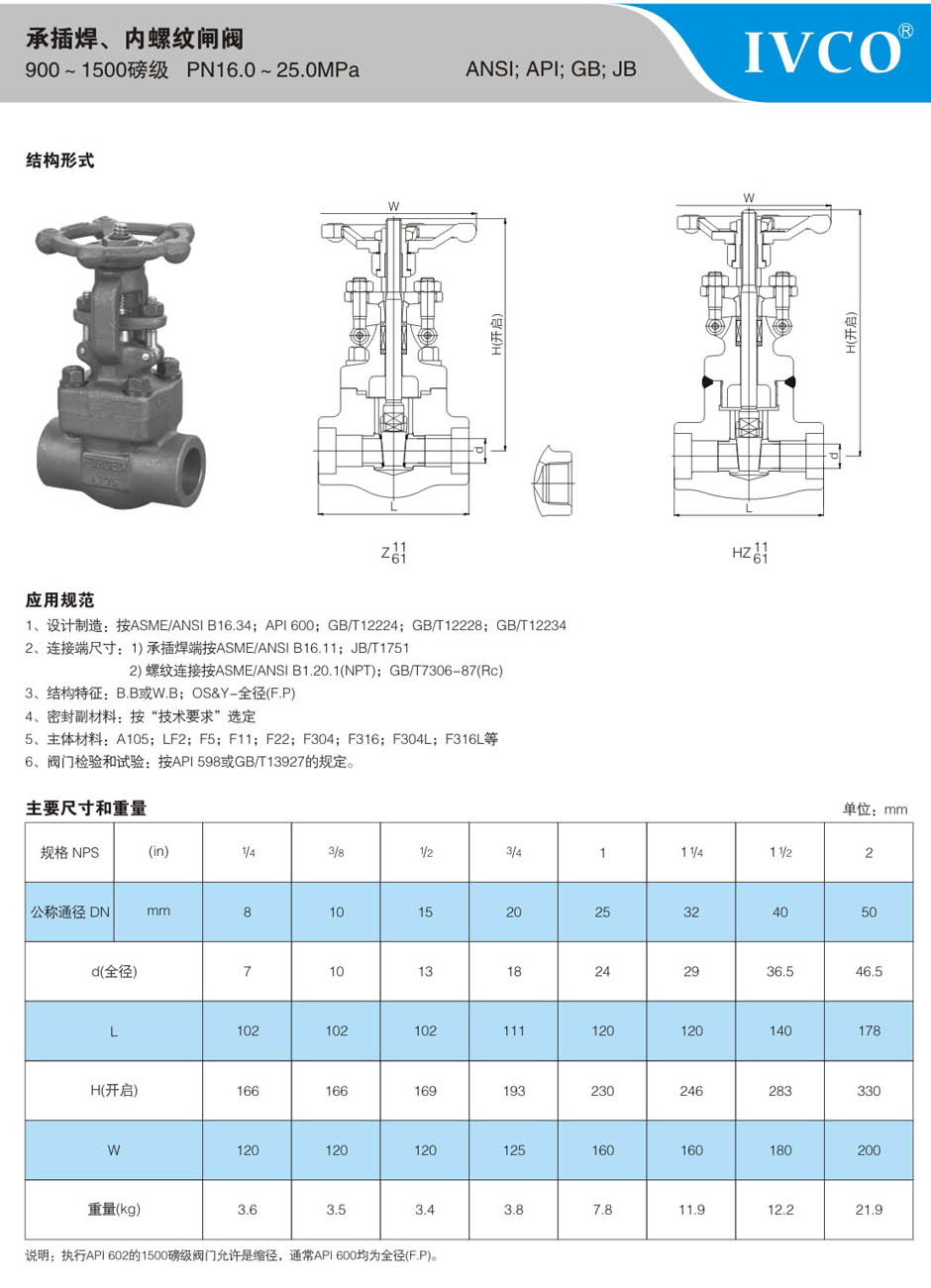 900-1500LB承插焊、内螺纹闸阀