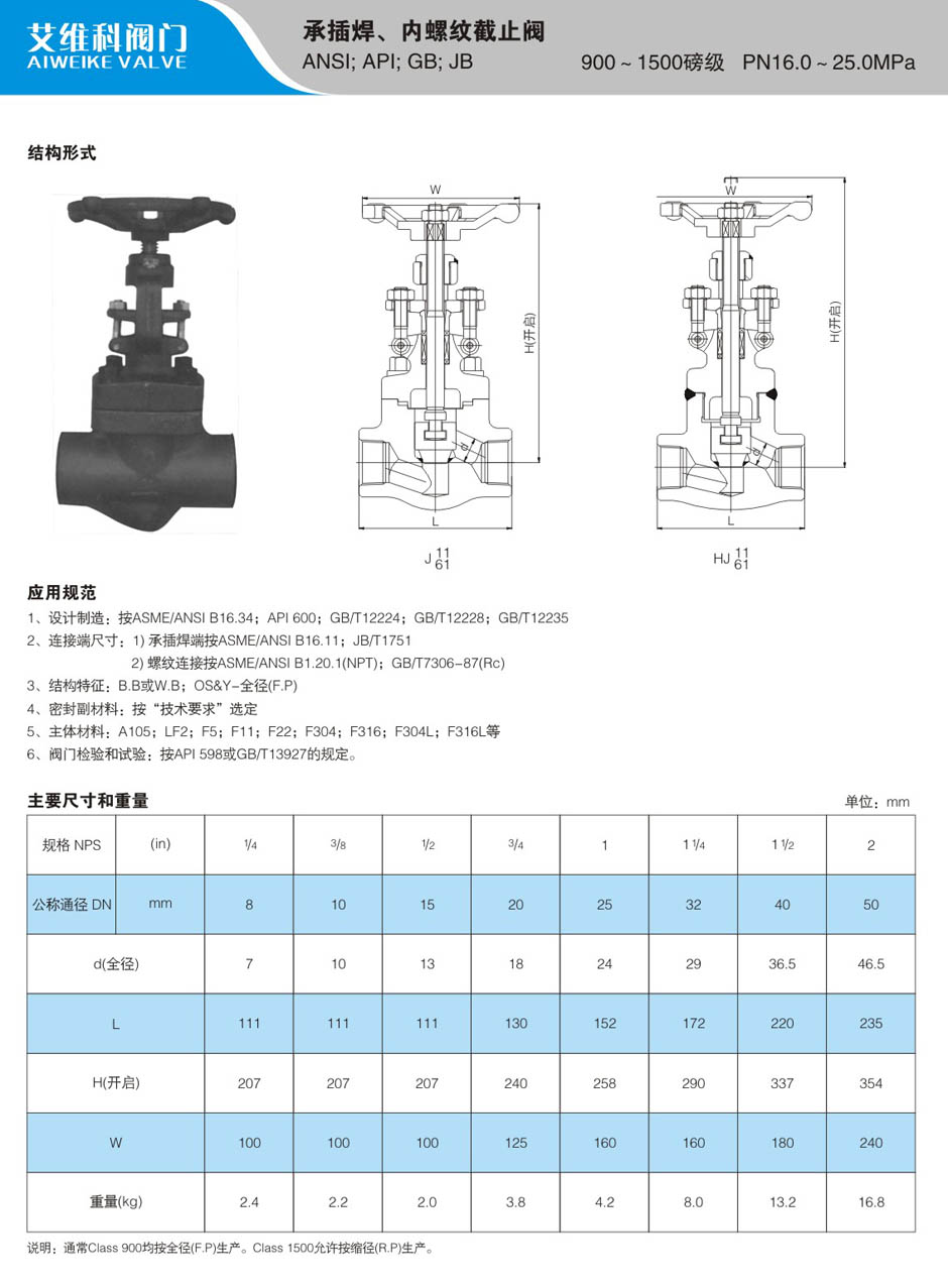 900-1500LB锻钢承插焊内螺纹载止阀
