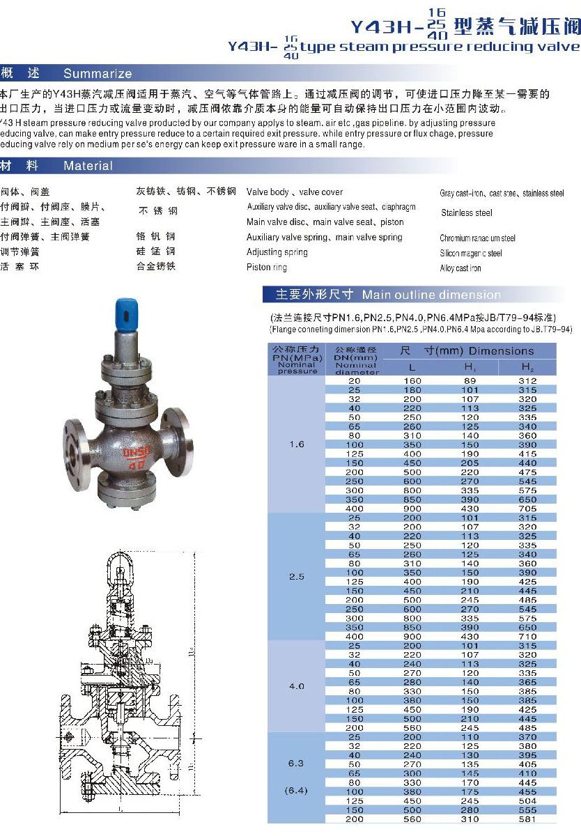 本厂生产的y43h蒸汽减压阀适用于蒸汽、空气等气体管路上。通过减压阀的调节,可使进口压力降至某一需要的出口压力,当进口压力或流量变动时,减压阀依靠介质本身的能量可自动保持出口压力在小范围内波动。