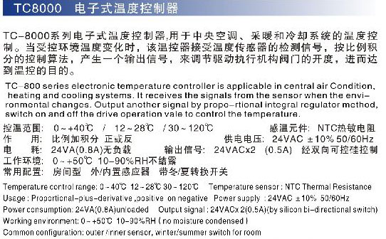 tc-8000系列电子式温度控制器,用于中央空调、采暖和冷却系统的温度控制。当受控环境温度变化时,该温控器接受温度传感器的检测信号,按比例积分的控制算法,产生一个输出信号,来调节驱动执行机构阀门的开度,进而达到温控的目的。