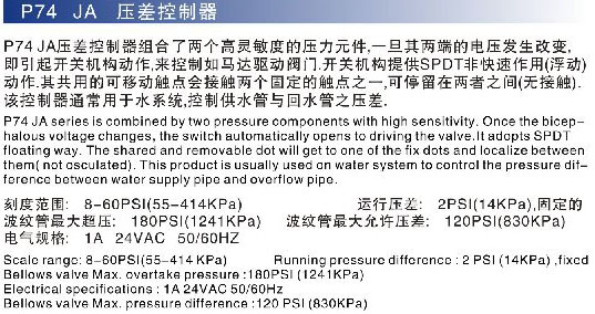 p74ja压差控制器组合了两个高灵敏度的压力元件,一旦起两端的电压发生改变,即引起开关构成动作,来控制如马达驱动阀门。开关机构提供spdt非快作用(浮动)动作。