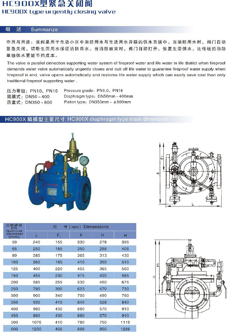 作用与用途:该阀是用于生活小区中消防用水与生活用水并联的供水系统中。当消防用水时,阀门自动紧急关闭,切断生活用水保证消防用水。当消防结束时,阀门自动打开,恢复生活供水,比传统的消防单独供水更能节约成本。