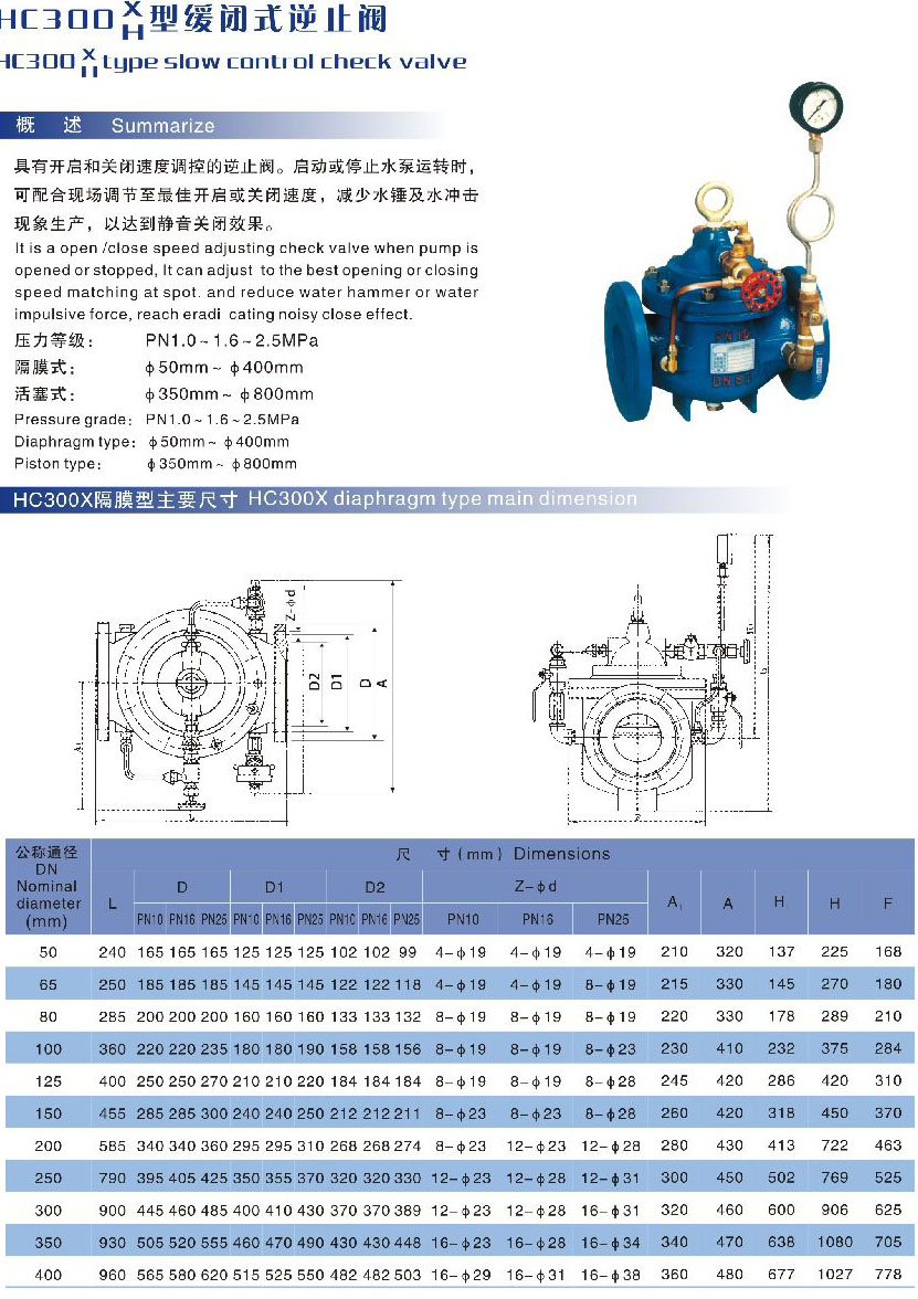 具有开启和关闭速度调控的逆止阀。启动或停止水泵运转时,可配合现场调节至佳开启或关闭速度,减少水锤及冲击现象生产,以达到静音关闭效果。