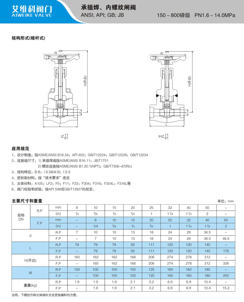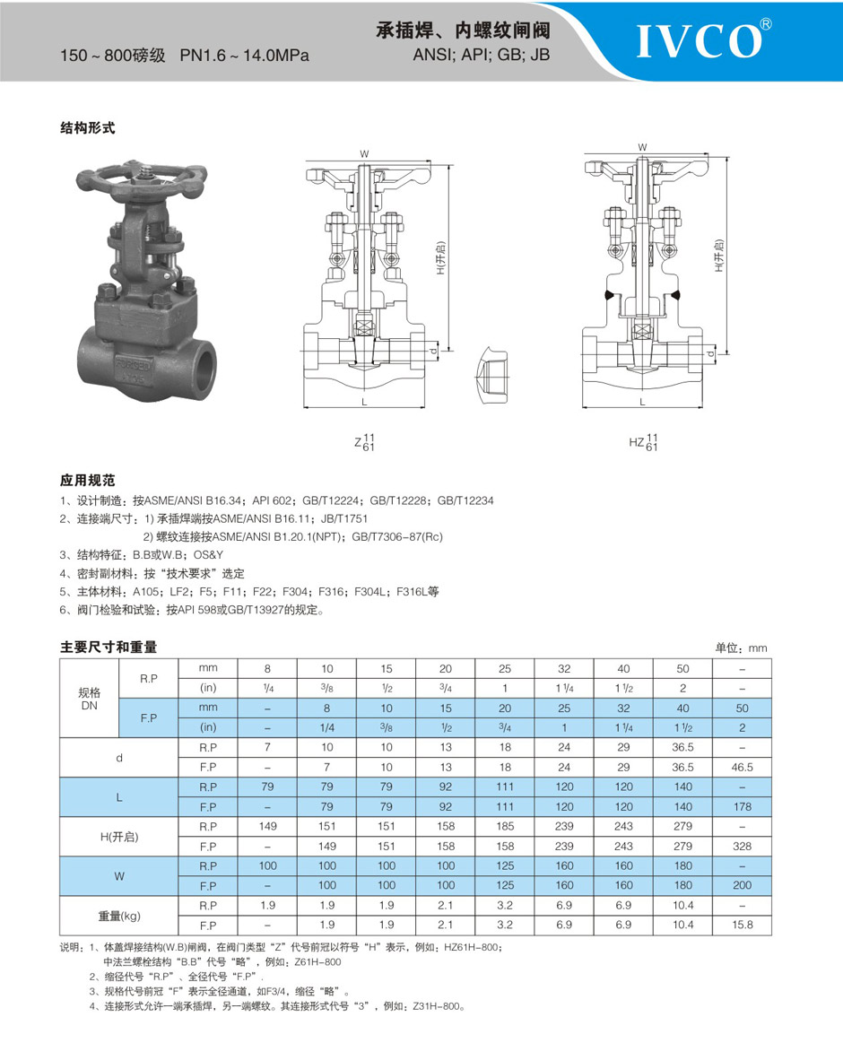 150-800LB承插焊、内螺纹闸阀