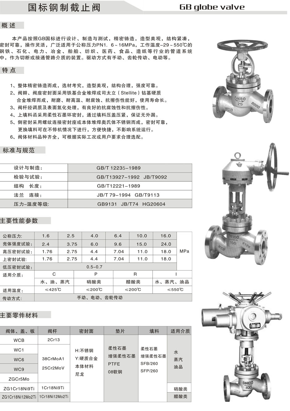 本产品按照gb国际进行设计、制造与测试,精密铸造,造型美观,结构紧凑,密封可靠,操作灵活,广泛适用于公称压力pn1:6~16mpa,工作温度-29~550℃的钢铁、石化、电力、冶金、船舶、纺织、医药、食品、造纸等行业的管道系统中。