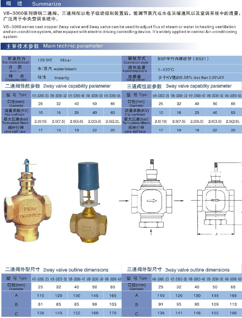 vb-3000系列铸铜二通阀、三通阀配以电子驱动控制装置后,能调节蒸汽或水在采暖通风以及空调系统中的流量,广泛用于中央空调系统中。