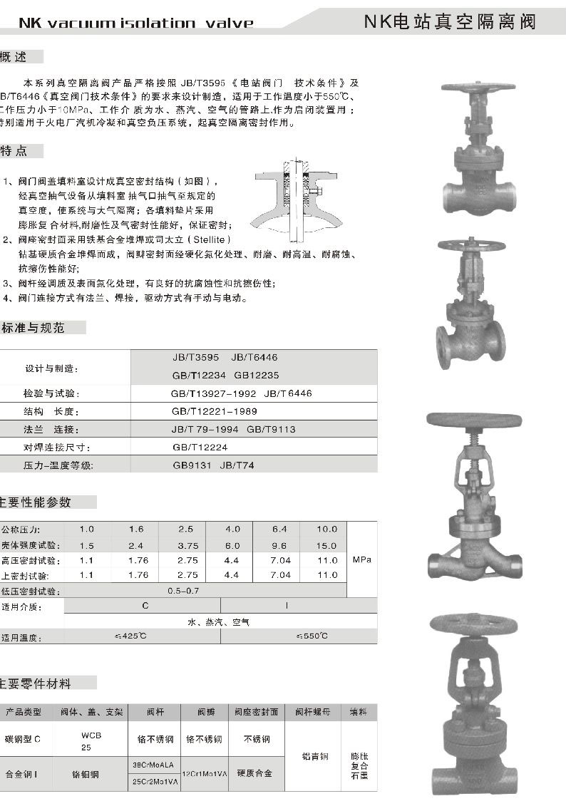 本系列真空隔离阀产品严格按照jb/t3595《电站阀门 技术条件》及jb/t6446《真空阀门技术条件》的要求来设计制造,适用于工作温度小于550℃、工作压力小于10mpa、工作介质为水、蒸汽、空气的管路上,作为启闭装置用特别适用于火电厂汽机冷凝和真空负压系统,起真空隔离密封作用。
