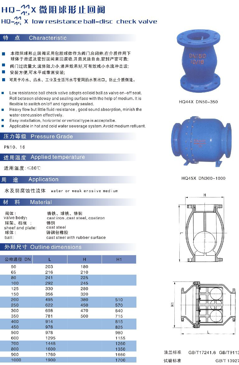 本微阻球型止回阀采用包胶球体作为阀门启闭件,在介质作用下球体于滑道及密封面间来回滚动,开启灵活自由,密封严密可靠;安装方便,可水平或垂直安装;可用于冷水、热水、工业及生活污水等管网的水泵出口,防止介质倒流。